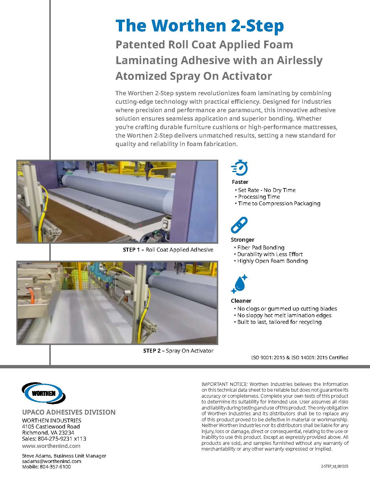 Worthen Industries introduces The Worthen 2-Step, a patented system designed to bring new levels of efficiency and quality to your foam fabrication process. This innovative solution combines a roll-coat-applied foam laminating adhesive with an airlessly atomized, spray-on activator, transforming how you work.